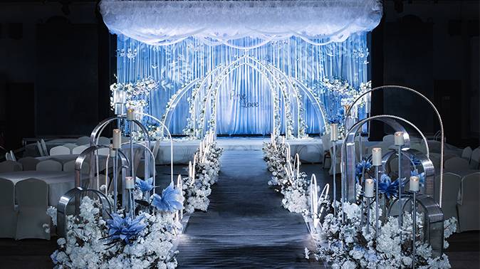 源于周杰伦与昆凌的盛世婚礼——Selby Abbey塞尔比教堂。用冰丝布幔打底,高价购入建筑类专业阳光板,使得教堂更为通透,辅以高仿真花艺与垂挂璀璨的珠片装饰,在洒满时光印记的教堂许下爱的箴言,神圣隆重,终身难忘。