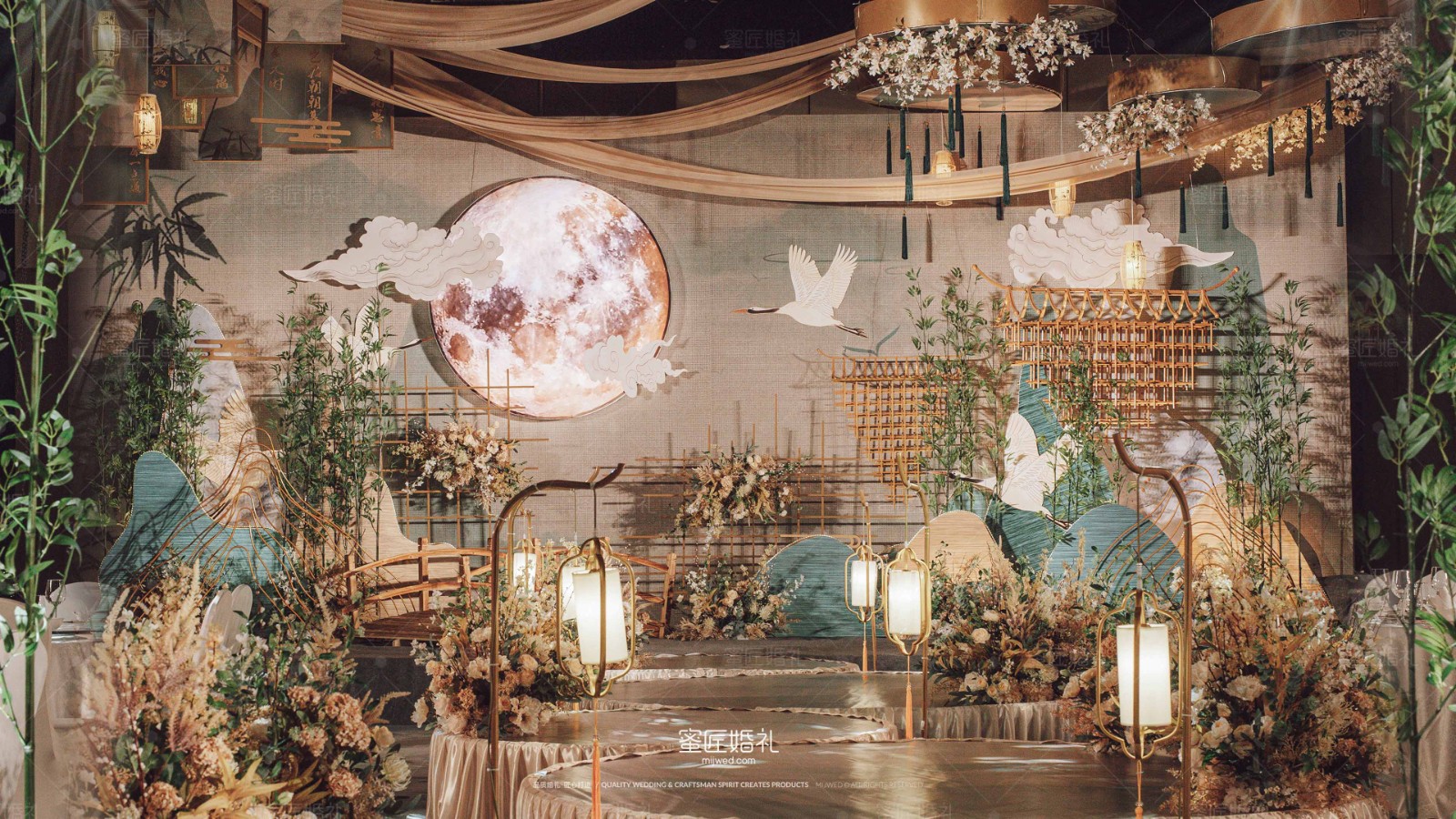灵感来源于“千里江山图”,整体设计在于表达“寄情于山水”的美感,提炼“千里江山图”中自然山水与人文情调,加以现代化轻奢风格元素,打造一场沉浸式新中式风格主题婚礼。