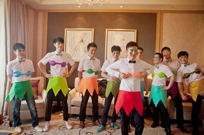 12、奇装异服来迎亲:头上的,身上的,没有做不到,只有你想不到的~此刻就要发挥伴郎的作用啦!