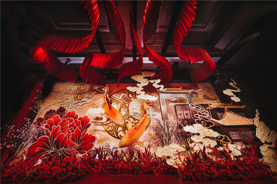 素色暗底纹的背景板上,一轮镂空弯月盘踞着,丝丝缕缕的祥云萦绕其上,两只栩栩如生的泡雕锦鲤游弋云间,硕大的牡丹花再其侧极尽绽放。舞台上方正红色绸布垂悬其上,来回蜿蜒,华丽繁复。仪式通道以蜿蜒红绸吊顶,两旁是艳丽热闹的红色花朵,一盏盏小桥精致的宫灯一路相迎。入口处,四盏红色线帘当中是活灵活现的泡雕锦鲤,朦胧中愈显奇幻。迎宾区以鱼尾、海浪、祥云共同组成莲座般的背景板。金色锦鲤正奋力前游,鱼跃而起。大红色的牡丹手工画如点睛一般,让整个场景霎时浓艳了起来。