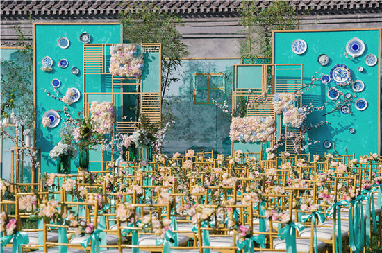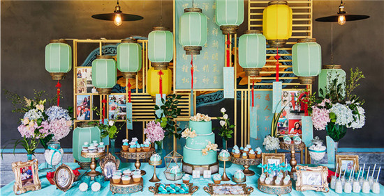 当古色十足的墨韵山水遇上时尚的Tiffany蓝,就像时尚俏皮的都市丽人遇上温文尔雅的谦谦君子,爱意就此蔓延。主舞台以北宋王希孟的《千里江山图》为灵感,融入代表家庭婚姻幸福的Tiffany蓝色调。镜片高低错落,两侧的镜片上悬挂着大大小小的青花碗碟。一场现代时尚与古风古韵相结合的婚礼如画卷一般徐徐展开展开,西式的花艺清新雅致,东方的细密竹枝英挺飒爽,两厢结合趣味十足。甜品区错落的挂着盏盏淡青色宫灯,青绿与淡蓝的配色映入眼帘。如果爱有颜色,那无疑就是Tiffany蓝,它是爱,是幸福与梦想。