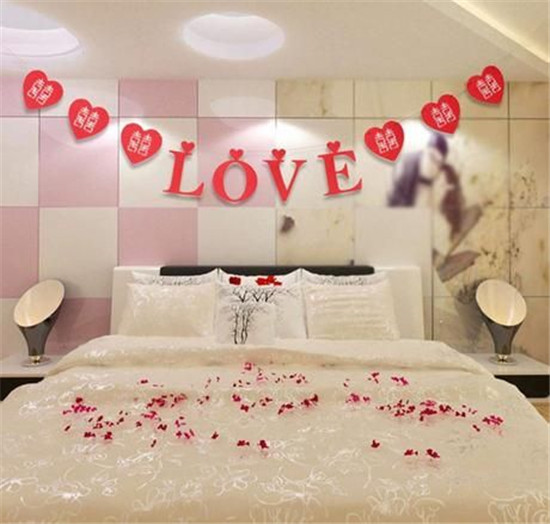 现在市场上,拉花的种类繁多,可以选择五颜六色的、纯红色,在材质上也可以选择塑料的、纱幔的、彩质材质等等类型,在婚房布置的时候,可以选择自己较喜欢的拉花,将房间布置的温馨又喜庆。