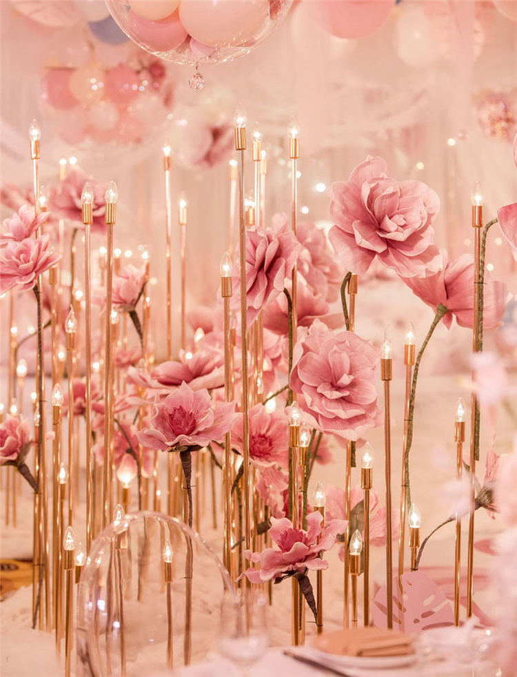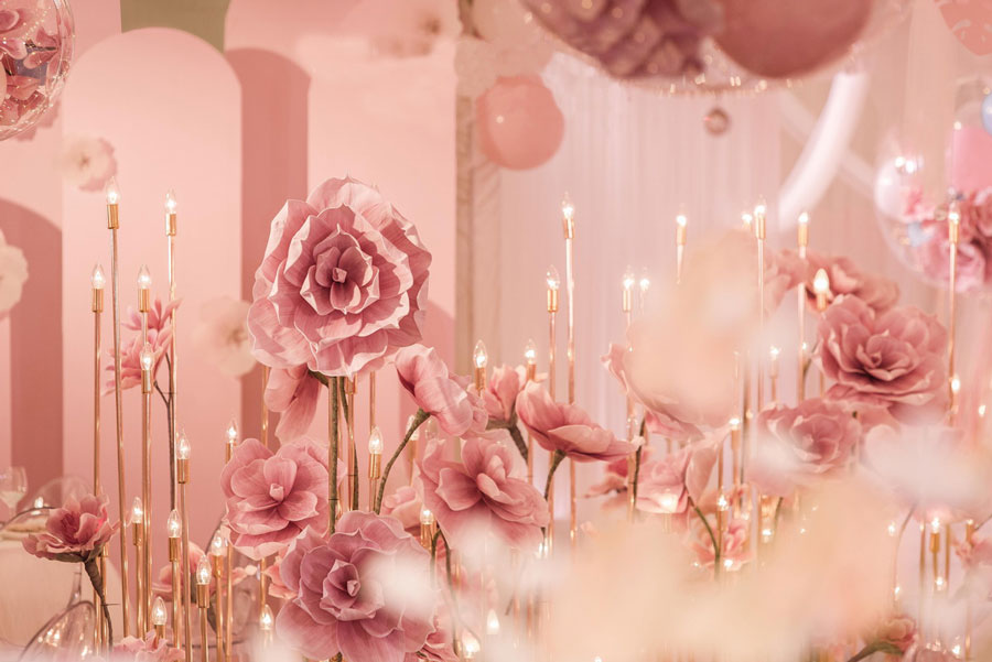 仪式通道两侧是大朵盛放的手工花,如精致的女子,附耳谈笑,娇俏惹人,深浅错落间还点缀着几盏星光,一如佳人较美的韶华。