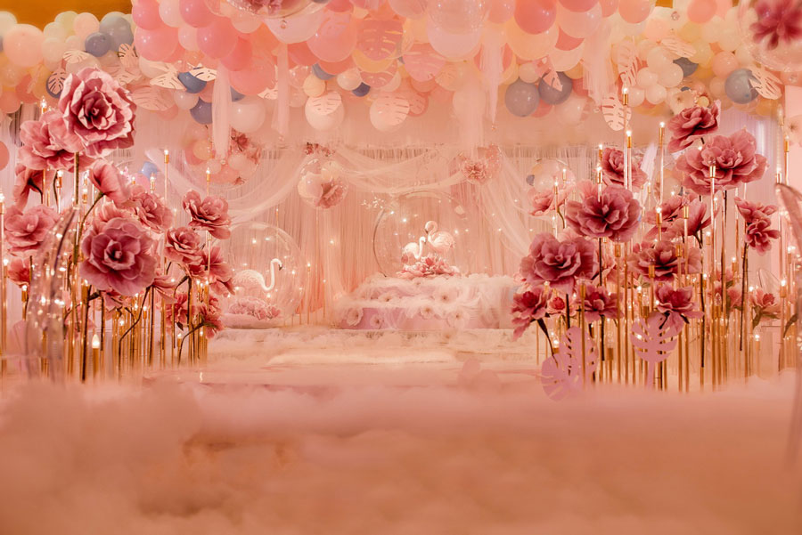 舞台选用淡粉色的冰丝布幔作为舞台背景,轻柔的白纱和梦幻的气球共同组成大型舞台吊顶,舞台正中央的粉色花台上,透明的玻璃球里两只仙鹤交颈依偎,浓情蜜意。