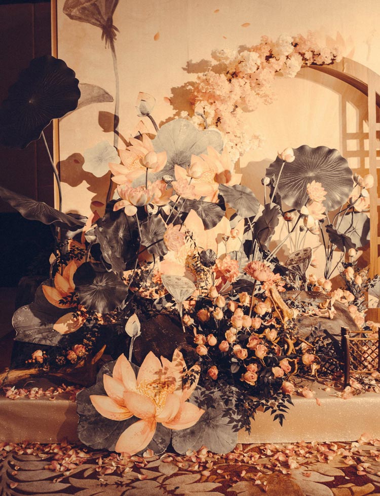 两侧笔墨晕染,青荷亭亭玉立。仪式通道上莲荷摇曳,正如那句“叶子底下是脉脉的流水”,花瓣满地,灯光下波光粼粼,在这场婚礼中更加闪烁,荡漾了人心。迎宾区马头墙上金鱼嬉戏,新人两姓并立成印,墙角是大片的荷花丛,墙头是缥缈的祥云,岁月静好。
