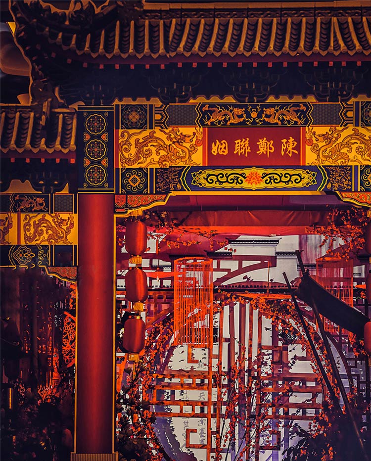 喜袍衫袂迎春风,玉刻麒麟腰带红。简约大气的中国风,一方面保留了中国风的古韵雅致,一方面又不至于繁琐。精致的亭台楼阁为背景,主舞台是飞檐翘角的古建筑,其侧巨大的窗扉映着佳人起舞的轮廓剪影,金色灯带挽成的祥云和牡丹点缀在舞台正上方。