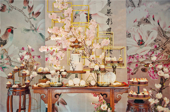 如果会场是中式风格的,中式婚礼将是一个不错的选择,比如传统风格的四合院。我们可以用红色、红粉、红黄、玫红、粉紫等色彩的组合。新人喜欢现代婚礼形式,但也要尊重传统文化,不要用纯白色去装饰中式风格很浓的会场。另外明亮度很低的深蓝、深紫不宜大面积使用会给人以消沉的感觉,我们可以加浅色的花来调和。