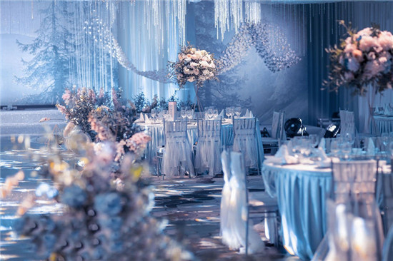 婚礼现场装饰更强调的是一个宏观的效果,花艺装饰只是其中的一个重要的组成部分,花艺的整体色彩要与会场的装修风格,室内灯光色彩,以及墙壁、地毯、桌布、椅套、口布等色彩相呼应相协调。所以说环境是一个不容忽视的重要因素。