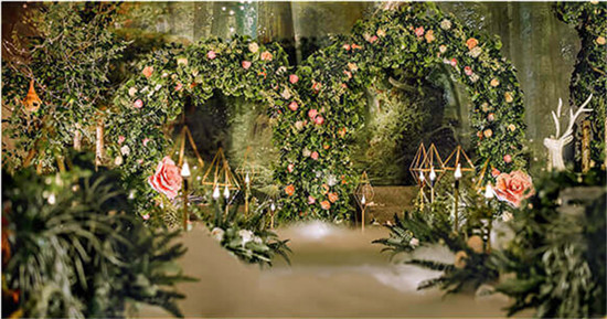 想要举办户外婚礼的朋友,可以仿造温室的设计,打造出梦幻的绿色花房风格,搭建简易的屋顶,布置上绿色的植栽,一眼望去仿佛置身丛林秘境。