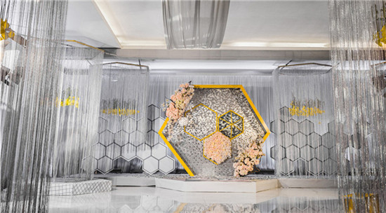 舞台以银色冰丝布幔吊顶,两侧装饰线帘和倒悬的花朵,舞台中央选用了家装式的银白小方块进行拼接,作为舞台背景的主体,正中央是一个六边形的粉色花艺,花艺中央一把精致的钥匙镶嵌其中,两旁点缀几个大小不一的几何六边形元素,简约而又大方,仪式通道沿