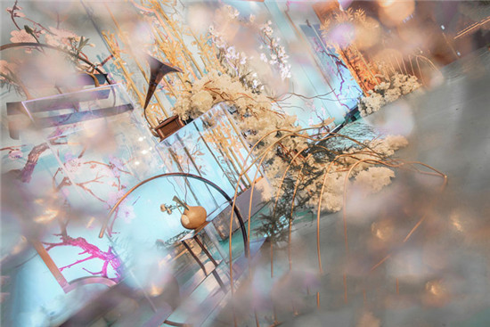 半侧楼阁造型的亚克力景片立于两侧,亦是一道亮色,桃枝盛开的仪式通道,好似水乡柔情,湖面波光粼粼。主舞台青山远黛,圆形背景上,佳人倩影,婷婷袅袅;金色荷花铁艺造型零星错落散布,映衬着水蓝色的纱幔背景,一幅仙子游湖的画卷就此展现在众人面前。迎宾区金竹林立,木质屏风折于一旁,几支梨花枝破窗而入,美艳动人。
