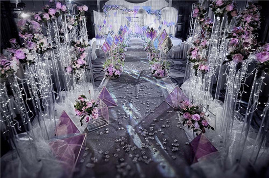 繁花入梦,瞬间永恒,这场浪漫优雅透着一丝神秘的蓝紫色系婚礼,就像花瓣刚好飘过盛夏后留下的一场繁华,似花似梦。婚礼蓝紫色为主,银灰为辅,以一种低饱和度、多层次感的简约格调打造出优雅小香风,加上清新蓝的低调润色,整场婚礼可谓是美的浑然天成。通道由紫蓝色花艺和定做菱形铁艺铺陈,小资情调银灰色珠光散落地毯,两路繁华相送,华美人更娇。同时采用极具新意的透明亚克力管与蓝泽色花艺,雾纱相搭,浪漫一路蔓延,内壁星光闪耀,与你花下看遍星辰。