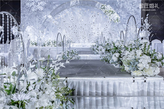 Abbey塞尔比教堂,以线为绣,可织岁月;以心为绣,可织江山,在洒满时光印记的教堂许下爱的箴言,神圣隆重且终身难忘。整场婚礼大气简约,将教堂叹为观止的精美设计搬到舞台,繁冗的结构线条化,再高价购入建筑类的专业板材阳光板,让目光所及的每一个细节都传递着精致与庄重。珠光路引由主舞台延伸而出,白色灯饰花艺与教堂拱门视觉上高度一致,让整场婚礼呈现出放射性气场,在视觉审美上犹如浑然天成。点睛之笔还属弧形铁艺与阳光板以黄金比例错层,大朵特色荔枝花芙蓉出水的绝笔,无形中生出一种惊艳时光的灵动。