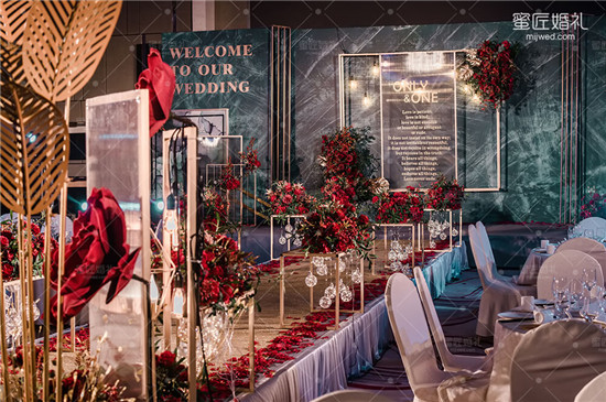 灵感源于皇室绿宝石之王——祖母绿,不但霸占着较优雅高贵的尊宠,且没有一种绿可以比之更美。当成熟稳重的祖母绿与荼蘼红在婚礼中相遇,碰撞出独具风格的神秘诱惑,与耀眼夺目的帝王金相依衬,气场收放自如,下一秒又强烈到窒息,赋予整场婚礼无可比拟的贵气及高级感。岁月如歌,爱你入骨,热情洋溢的酒红色花艺造型在两侧落红路引的见证下,与帝王金定制铁艺网格深情相拥,加上璀璨晶莹钨丝灯温馨助阵,T台的浪漫气质被烘托到极致。